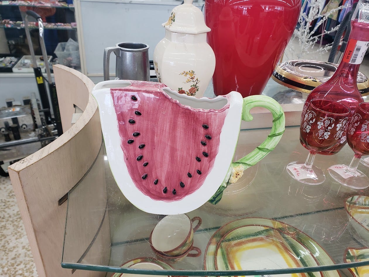 In the archives, looking at old letters, there was a time when the plural of Stadium was “Stadia.” Let’s bring that back! … Buzz walked to the mailbox in zero-degree temperatures and howling winds. And we forgot that the mailbox doesn’t even open anymore! It opens two inches. We had a pile of letters to mail, and we had to mail them two by two. While the wind threatened the blow us away, and passing motorists looked at us pityingly….Thrift shop item we just want to own …a pitcher shaped like a piece of watermelon, seen at Amvets, and pictured above. It must be gone by now, sigh. But what can we say? It’s a slice.
