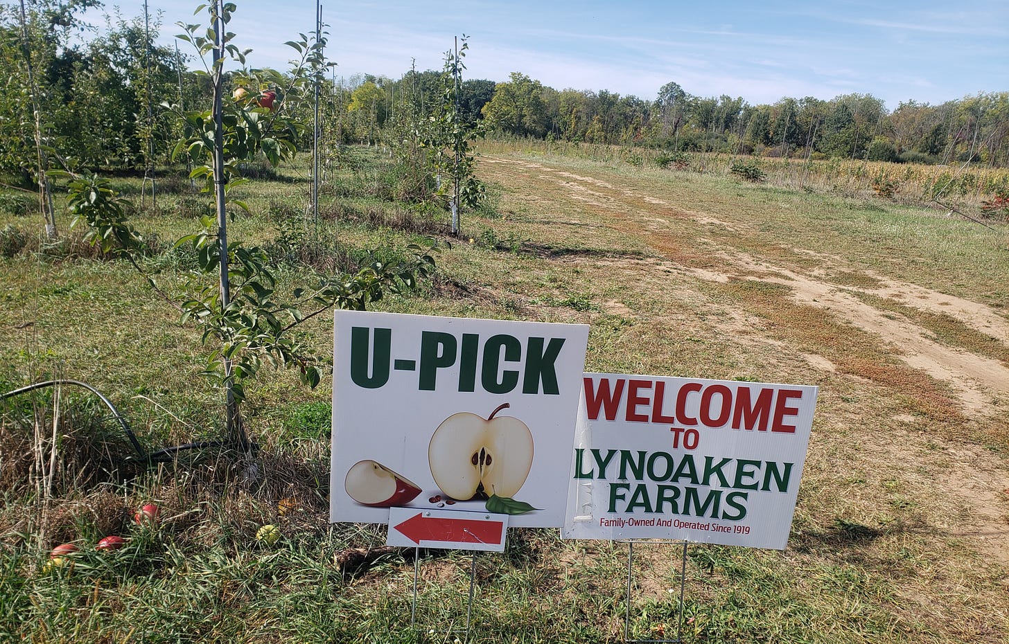 Hence, we went into the orchard ignorant. First we drove down a long — a very long — road that borders the apple trees. We wondered if that was allowed. Later, you guessed it, we learned it was not.